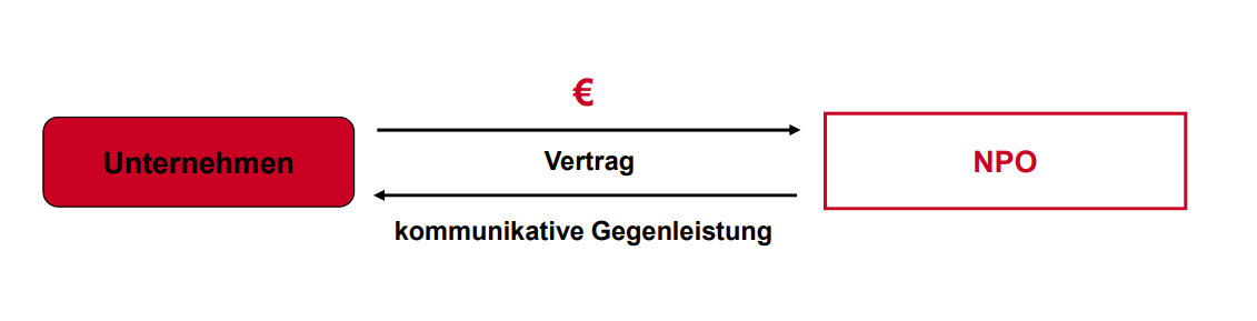 Anders als bei einer Spende, die freiwillig und ohne Gegenleistung gegeben wird, bedeutet Sponsoring ein vertraglich vereinbartes Geschäft, das auf dem Prinzip der Leistung und Gegenleistung beruht: Für seine Geld-, Sach- und Dienstleistungen und/oder sein Know-how wird der Sponsor meist in besonderer Weise z. B. in den Kommunikationsmedien, etwa auf Plakaten, in Anzeigen, auf der Website und auf Veranstaltungen der geförderten Organisation als Förderer öffentlichkeitswirksam genannt. Ziel ist es, auf diese Weise die Bekanntheit des Unternehmens sowie den positiven Imagetransfer aktiv zu befördern.